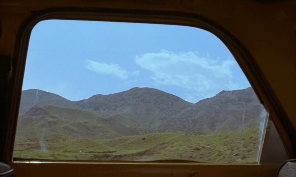 The Iranian film director depicts the landscape using two different camerawork techniques. One method places the camera inside a moving car, whose interior often serves as a setting in his films. In this case, the scenery is captured from the limited viewpoints of the traveling characters—through the front or side window glass. The opening scenes of And Life Goes On (Zendegi va digar hich, 1992) and Taste of Cherry take place almost entirely inside vehicles.