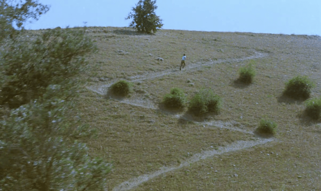 Besides the photographic impact of the landscape compositions, Kiarostami directs the viewer’s attention to the natural environment through variations of individual motifs and shots. In Where Is the Friend’s House?, a boy repeatedly runs between two villages over a hill. These journeys are filmed each time in series of similar types of shots that capture the landscape between the two villages. The most striking view is of the winding road leading to the summit with a solitary tree. This motif is then quoted in the sequels of the trilogy—And Life Goes On and Through the Olive Trees (Zire darakhtan-e zeyton, 1994). However, the familiar environment is shot from different angles: in the first case from a car, in the second through the branches of another tree.