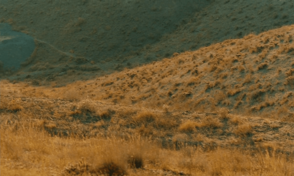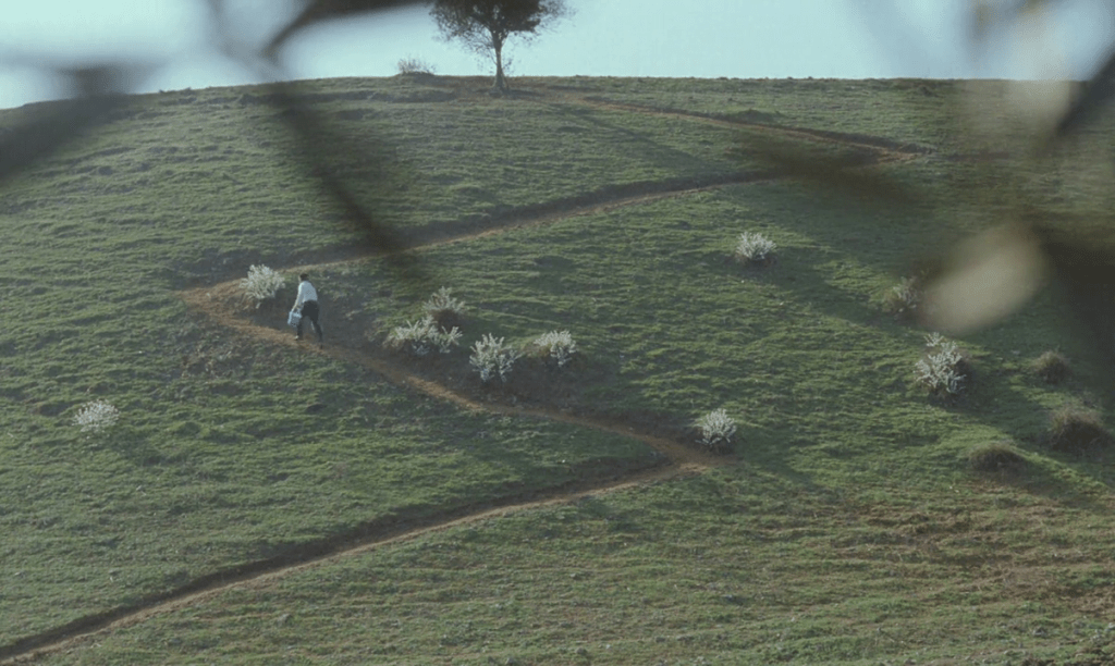 At the beginning of The Wind Will Carry Us, this opposite narrative approach is chosen: the car is shown exclusively in landscape compositions, while the soundtrack delivers the dialogue of the characters inside the vehicle. This technique distances the viewer from the characters and shifts the environment into a dominant position. Some of these observational shots in Kiarostami’s films are accompanied by the voiceover of “old sages” who accompany the protagonists on their journeys. These comments describe the beauties of the world and encourage the viewer to reframe their attention toward the aesthetic value of the landscape.