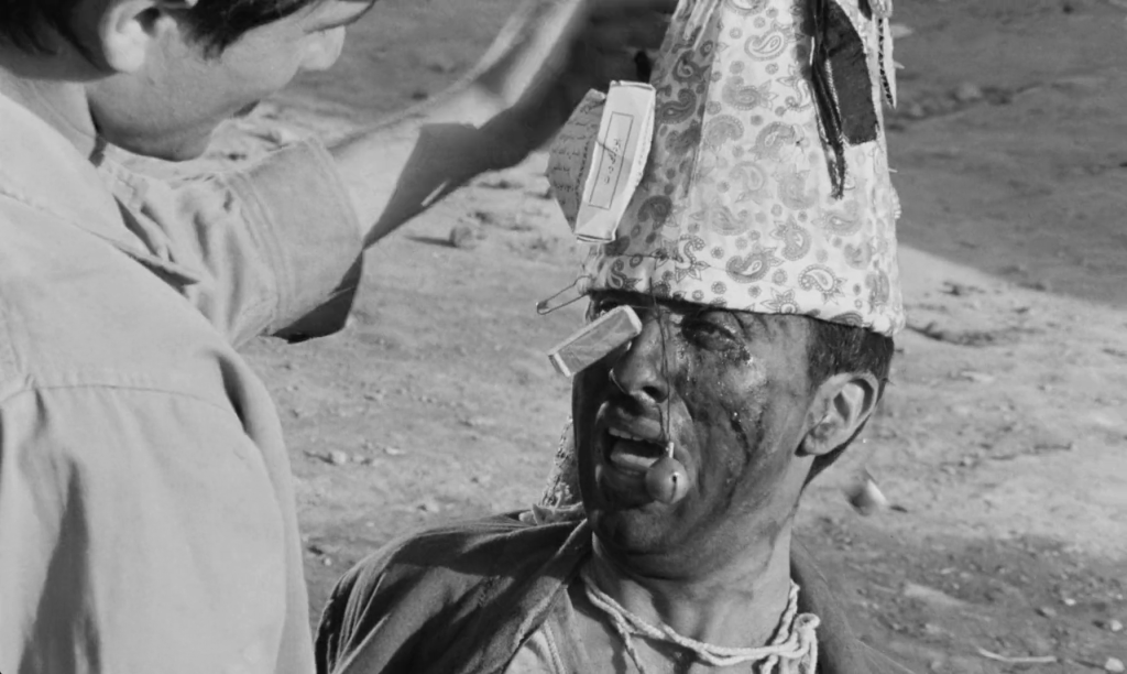 Another character introduced in the film is the village madman, whose torment opens the story. His suffering brings a powerful social critique into the film. Mashadi Safar’s son—a young man who takes pleasure in cruelty—smears black tar on the madman’s face while he is tied up, puts a ridiculous hat on his head, and then burns him with flaming torches. Children and adults alike watch the groaning man as if he were harmless entertainment. A cowbell tied to the trembling madman as a mark of humiliation foreshadows Mashd Hasan’s later social exclusion.