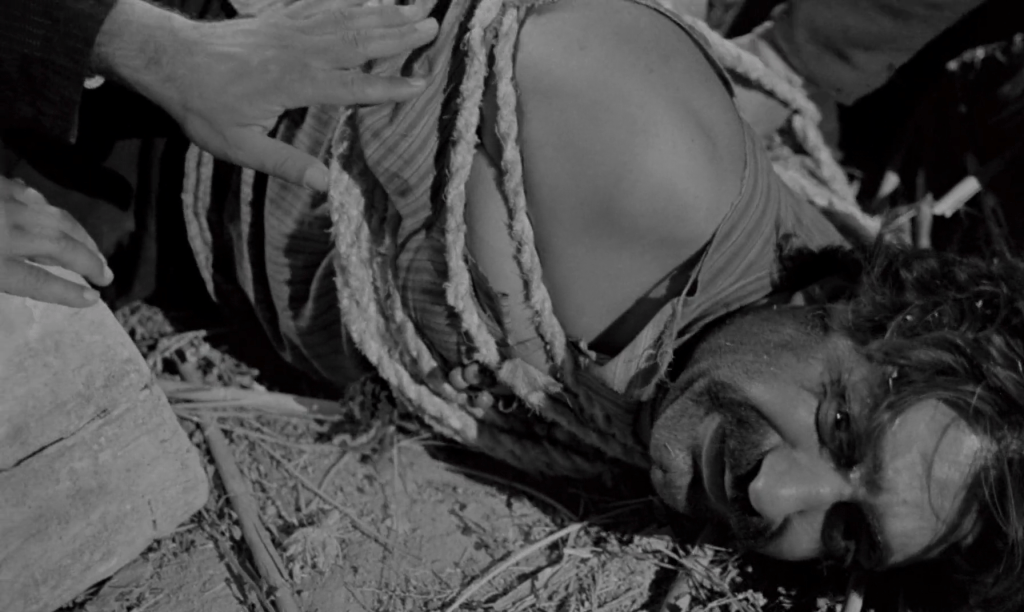 Mehrjui’s critical emphasis on violence is also evident in the scene where Mashd Hasan is tied with a rope while resisting capture. As three men escort him toward the city, Eslam—who otherwise appears the most moral and compassionate among them—erupts in rage and brutally drives Mashd Hasan forward with a wooden stick like a disobedient animal. Mashd Hasan then breaks free, flees in panic, and dies after falling into a ravine. In the book, we find no direct depiction of the binding, beating, or the protagonist’s death. The struggle between the three men and their frantic companion is suggested only indirectly: “The cow, with its small body, resisted and exhausted the men.”5 The narrator’s use of the word “cow” may indicate that the literary characters succumbed to a similar delusion as the film’s Eslam, ultimately identifying their companion with the animal as well.