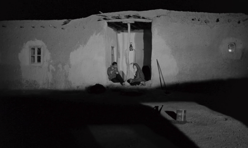 Beyond narrative parallelism, Mehrjui also applies artistic stylization to elements of the mise-en-scène. The opening title sequence presents Mashd Hasan and his cow in a sharply contrasted image that distinctly separates black and white. This color dichotomy is later echoed throughout the mise-en-scène. Particularly striking are the mud walls of rural houses painted bright white and illuminated by harsh sunlight. The opposing black appears in several nighttime scenes and in the dark chadors worn by women mourning at the cemetery.